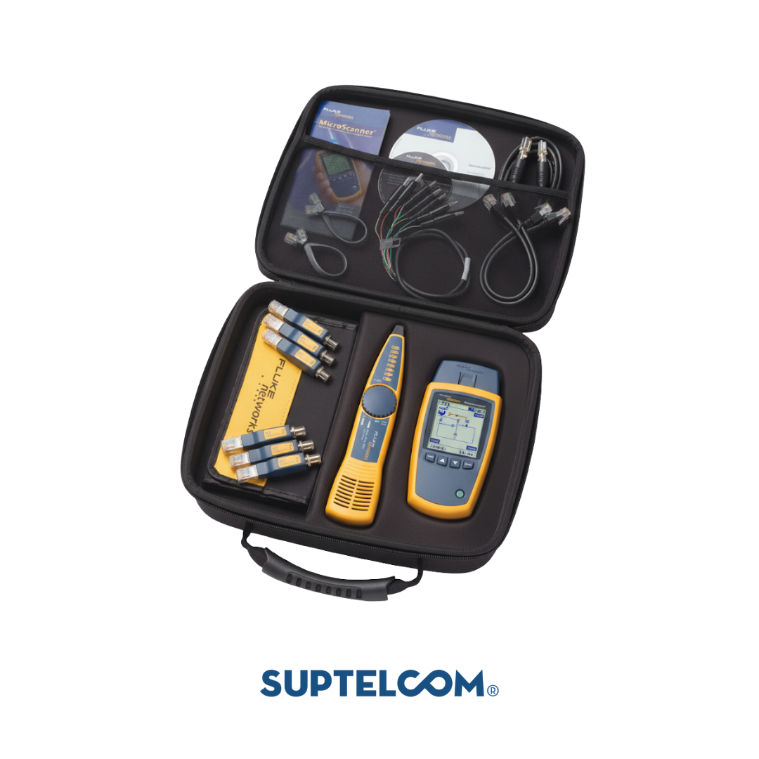 El kit técnico básico de cobre y fibra Fluke Networks MS2-FTK integra el MicroScanner² Cable Verifier y el SimpliFiber Pro Optical Power Meter, ofreciendo una solución completa para instalación, prueba y mantenimiento de redes híbridas. Permite mapear cableado, medir longitud y distancia a fallas, identificar servicios PoE y verificar conectividad Ethernet 10/100/1000, además de realizar mediciones ópticas simultáneas en seis longitudes de onda (850, 1300, 1310, 1490, 1550 y 1625 nm) con precisión de ±0,25 dB. Su tecnología IntelliTone™ digital y analógica localiza cables activos o pares con rapidez, mientras la función FindFiber® agiliza la identificación de rutas. Ofrece memoria para 1 000 resultados, conectores RJ11, RJ45 y coaxiales tipo F, rango de medición de +10 a –60 dBm, y alimentación con 2 baterías AA que brindan más de 50 horas de autonomía. Diseñado conforme a normas ANSI/TIA, CE y CSA, cuenta con protección láser clase 1, opera entre –10 °C y 50 °C, y se entrega con estuche portátil, garantizando desempeño profesional, durabilidad y trazabilidad en pruebas de cobre y fibr