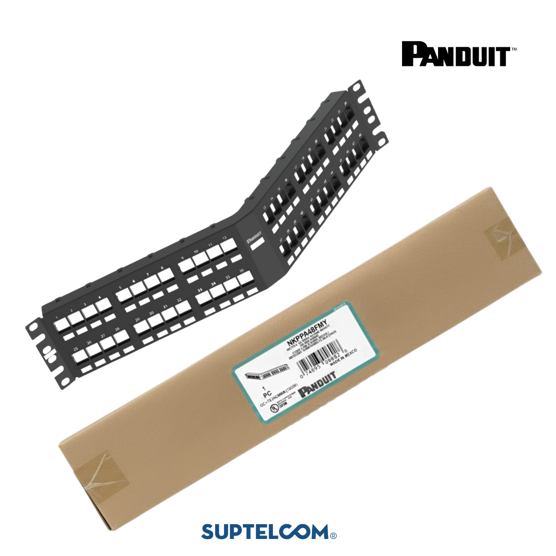 El patch panel NKPPA48FMY es una solución de parcheo de alta densidad que ofrece 48 puertos modulares en un espacio de dos unidades de rack (2 RU). El diseño angular característico de Panduit permite que los cordones de parcheo se enruten directamente hacia los organizadores verticales, manteniendo el radio de curvatura adecuado y mejorando la estética del gabinete. El módulo NKPPA48FMY es totalmente compatible con la gama de jacks Keystone de la línea NetKey, permitiendo configuraciones mixtas de voz y datos en una plataforma unificada.